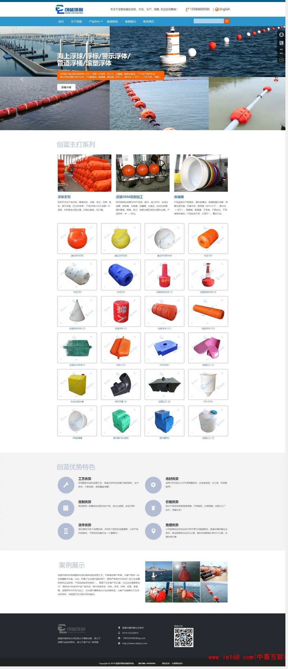 慈溪市创蓝环保科技有限公司专业加工各类浮体、 浮标、 浮球、 浮筒、 浮漂、 养殖桶、 滚塑异形件开发与加工、 污水提升器等等, 主打产品是各种浮体;球型浮体:直径为300mm; 400mm, 500mm, 600mm; 700mm; 800mm, 1000mm; 1200mm, 圆柱形一体浮体:ø300*H800; ø300*H1000; ø500*H700, ø600*H760; ø600*H1200mm; 管道浮体:浮体通孔内径有 ø30; ø50; ø110mm, ø127; ø160; ø220; ø300; ø700; ø375; ø430; ø480; ø530; ø580mm;还有各类方形浮箱; 正在开发的产品更是难以罗列。